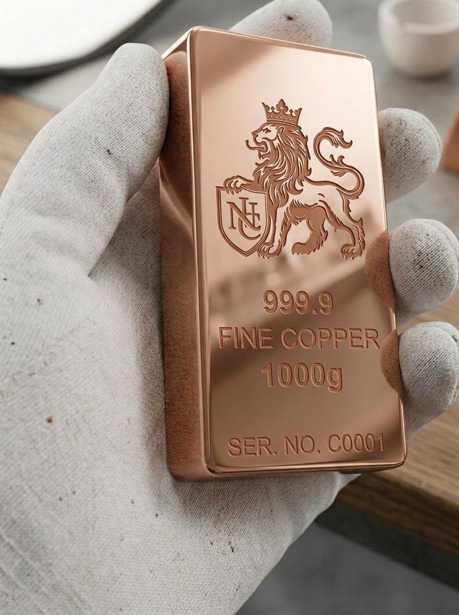 Polert 1 kg kobberbarre med LION-design og presisjons-lasergravering. Speilblank finish som fremhever graveringen — kombinerer investering og personlig preg.