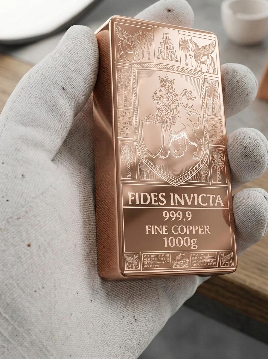 Polert 1 kg kobberbarre med eksklusivt LION LATIN-design og presisjons-lasergravering. Speilblank finish fremhever graveringens dybde — en unik kolleksjonsbarre med klassisk romersk motiv.