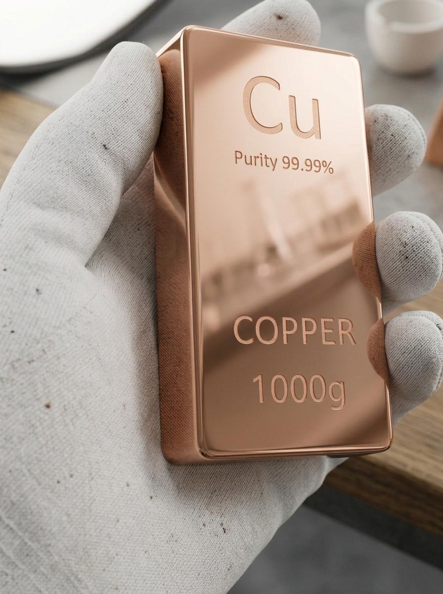 Polert 1 kg kobberbarre med standard lasergravering og serienummer. Speilblank finish — tidløs, ren og investeringsvennlig flaggskip-utgave.